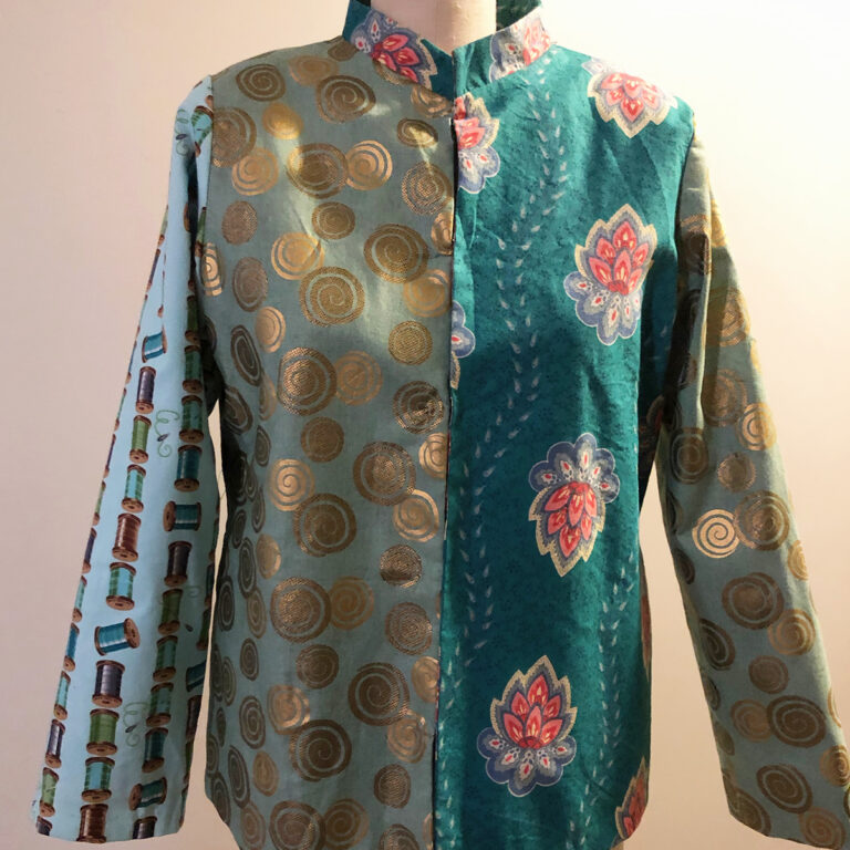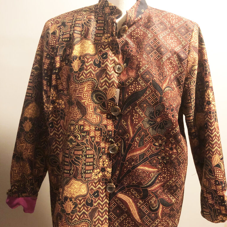 Item Description Jacket: Multi batik cottons. Satin lined. Multi buttons (M) B: 45 W: 44 H: 46 Arm circumference: 21.5” Sleeve length: 23″ Jacket Length: 25” $120.00 – SALE of…