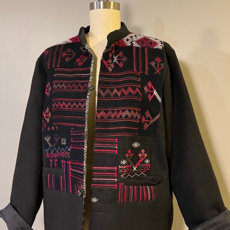 ITEM DESCRIPTION Reversible jacket designed with hill tribe fabrics. One side black fabric with authentic Vietnamese woven scarf fabric. Reverse side Hmong printed fabric on background of navy/black fabric B:…