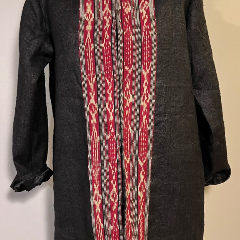 ITEM DESCRIPTION Hemp cloth coat accented with vintage handwoven front panel accent B: 45 W: 43 H 46 Coat Length: 37.5″ Sleeve length: 23″ Regular: $295 SALE of 40% off:…