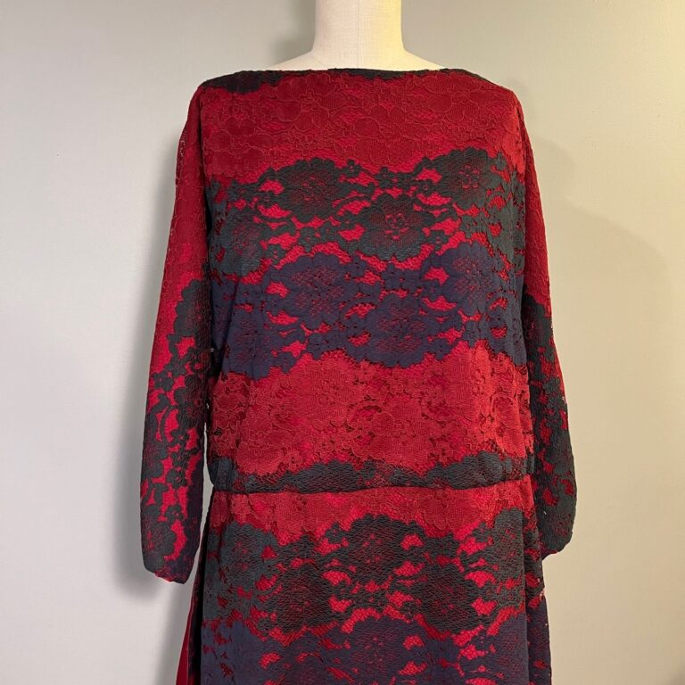 ITEM DESCRIPTION Deep red and navy medley lace tunic. Lined with slits on both sides B: 46 W: 44 H 48 Jacket Length: 25″ Sleeve length: 28″ Regular: $185 SALE…
