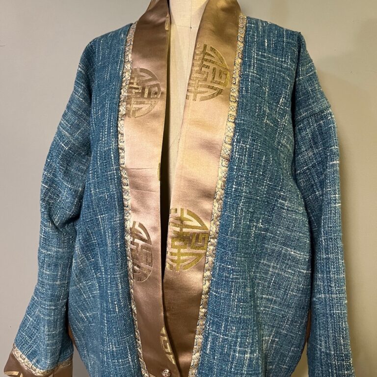 ITEM DESCRIPTION Hand woven ikhat pattern indigo cotton accented with shawl collar in Chinese embossed satin silk, Accented with glass beads. Back of jacket with hemp woven shoelace design B:…