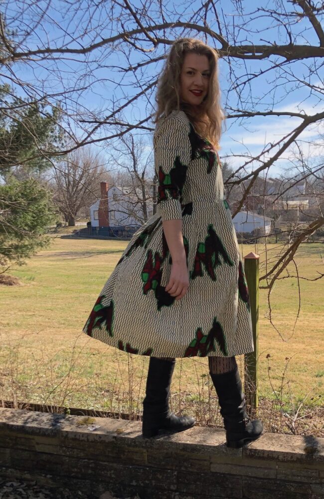 ITEM DESCRIPTION African print dress white back with bird in flight print. Covered fabric buttons PRICE: $225 Inquire as to availability for customer order Size Custom order Color multi print…
