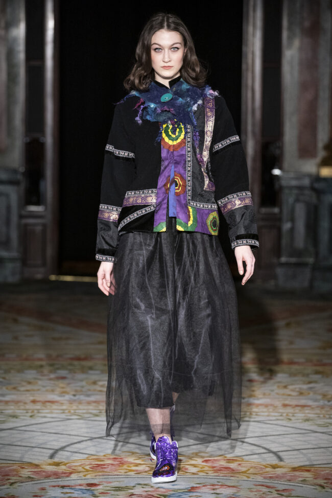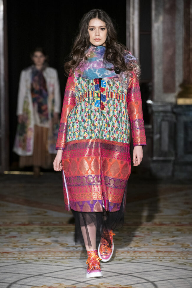 ITEM DESCRIPTION Celebrating how the brilliance of color makes our hearts sing. Indian brocade is accented with a vintage Guatemalan huipil in a coat designed by ellenlondon. Hook closures. MEASUREMENTS:…