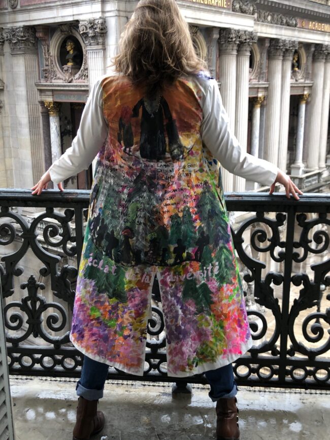 ITEM DESCRIPTION Hand painted silk coat celebrates our differences painted together. Hues of the forest during autumn painted on front panels. The back of the coat celebrates journey of refugees…