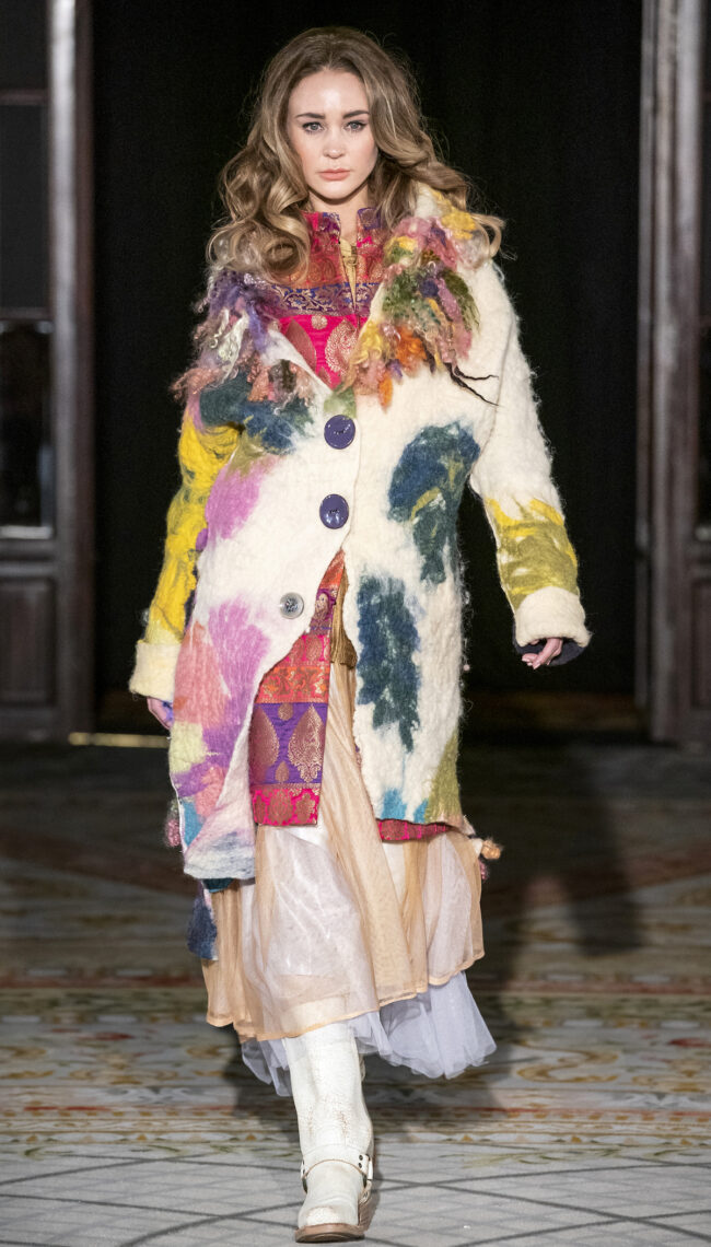 ITEM DESCRIPTION Felted coat celebrates our differences using felting techniques. Hues of the forest during autumn felted on coat. Artisan buttons. Back celebrates the journey of immigrants to the U.S.…