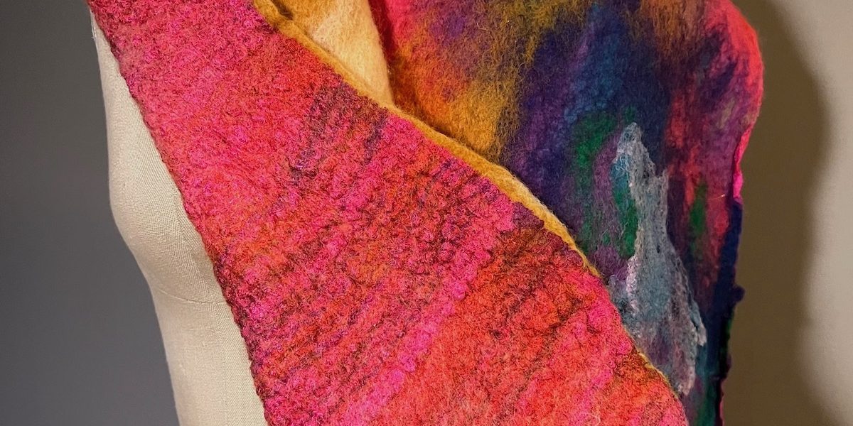 The new year has begun. . Hand created wet felted scarf with multi fuchsia silk layer.