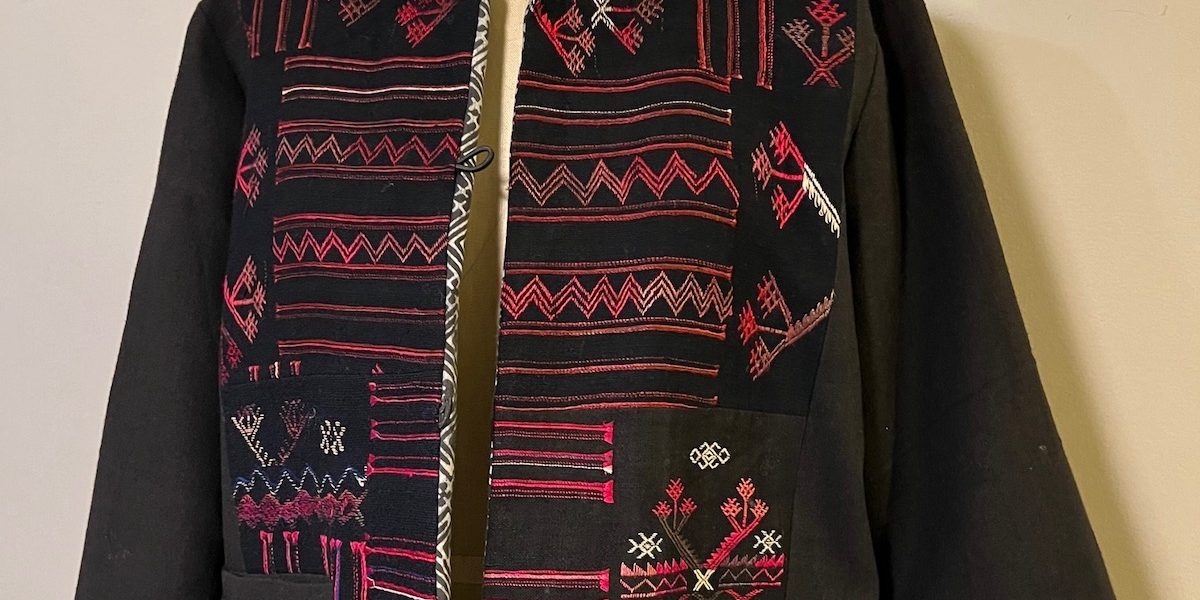 Reversible jacket designed with hill tribe fabrics. One side black fabric with authentic Vietnamese woven scarf fabric. Reverse side Hmong printed fabric on background of navy/black fabric