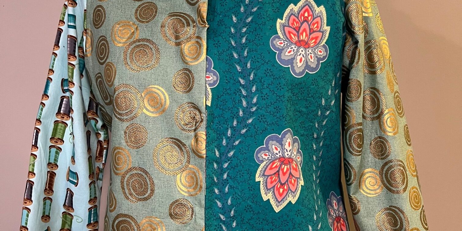 Cotton print fabrics from France, Africa and Indonesia combined on different panels of a statement jacket