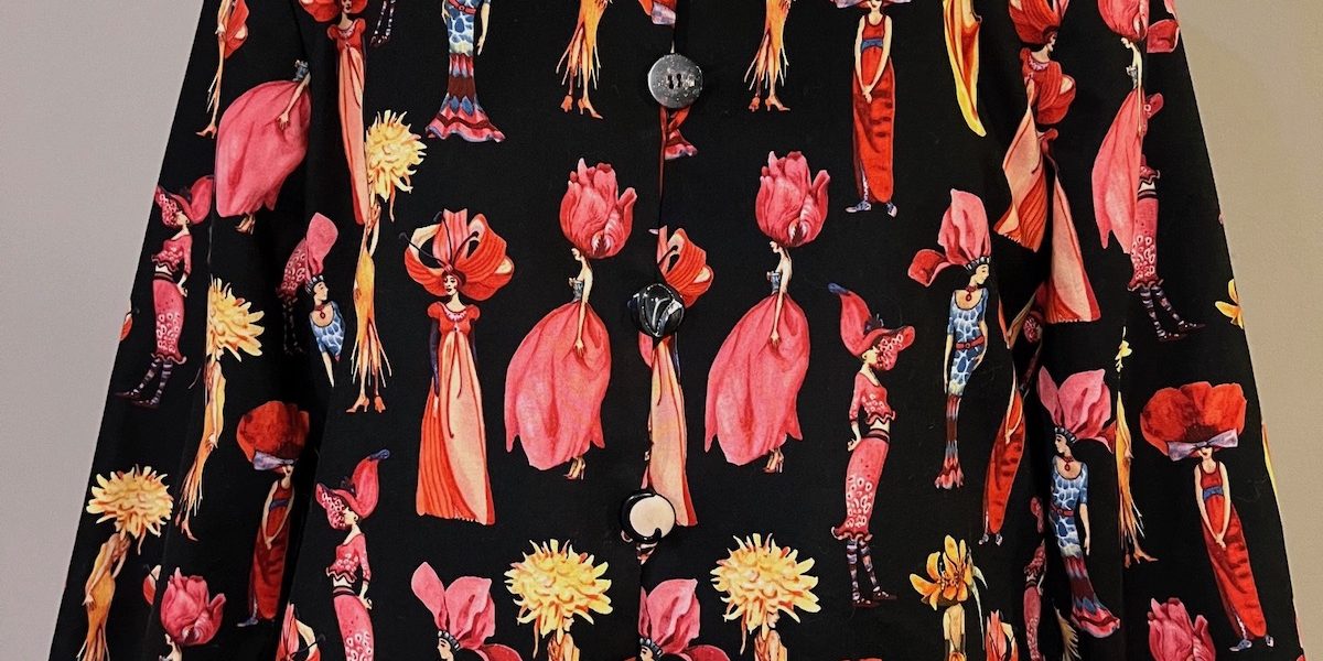 Cotton jacket with beautiful women print. Lined in pink. Multi buttons. Mandarin style collar.