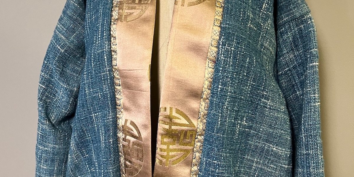 Hand woven ikhat pattern indigo cotton accented with shawl collar in Chinese embossed satin silk, Accented with glass beads. Back of jacket with hemp woven shoelace design