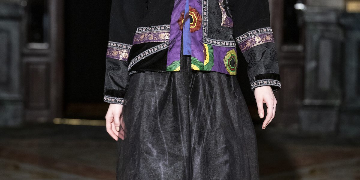 Recycled wool is accented with silk, African Kitenge cloth and ribbons in a timeless style. Bracelet length sleeves