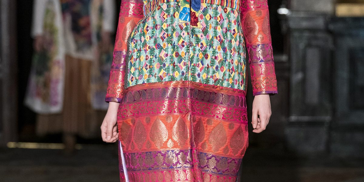 Celebrating how the brilliance of color makes our hearts sing. Indian brocade is accented with a vintage Guatemalan huipil in a coat designed by ellenlondon. Hook closures.