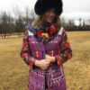 Celebrating how the brilliance of color makes our hearts sing. Indian brocade is accented with a vintage Guatemalan huipil in a coat designed by ellenlondon. Hook closures.