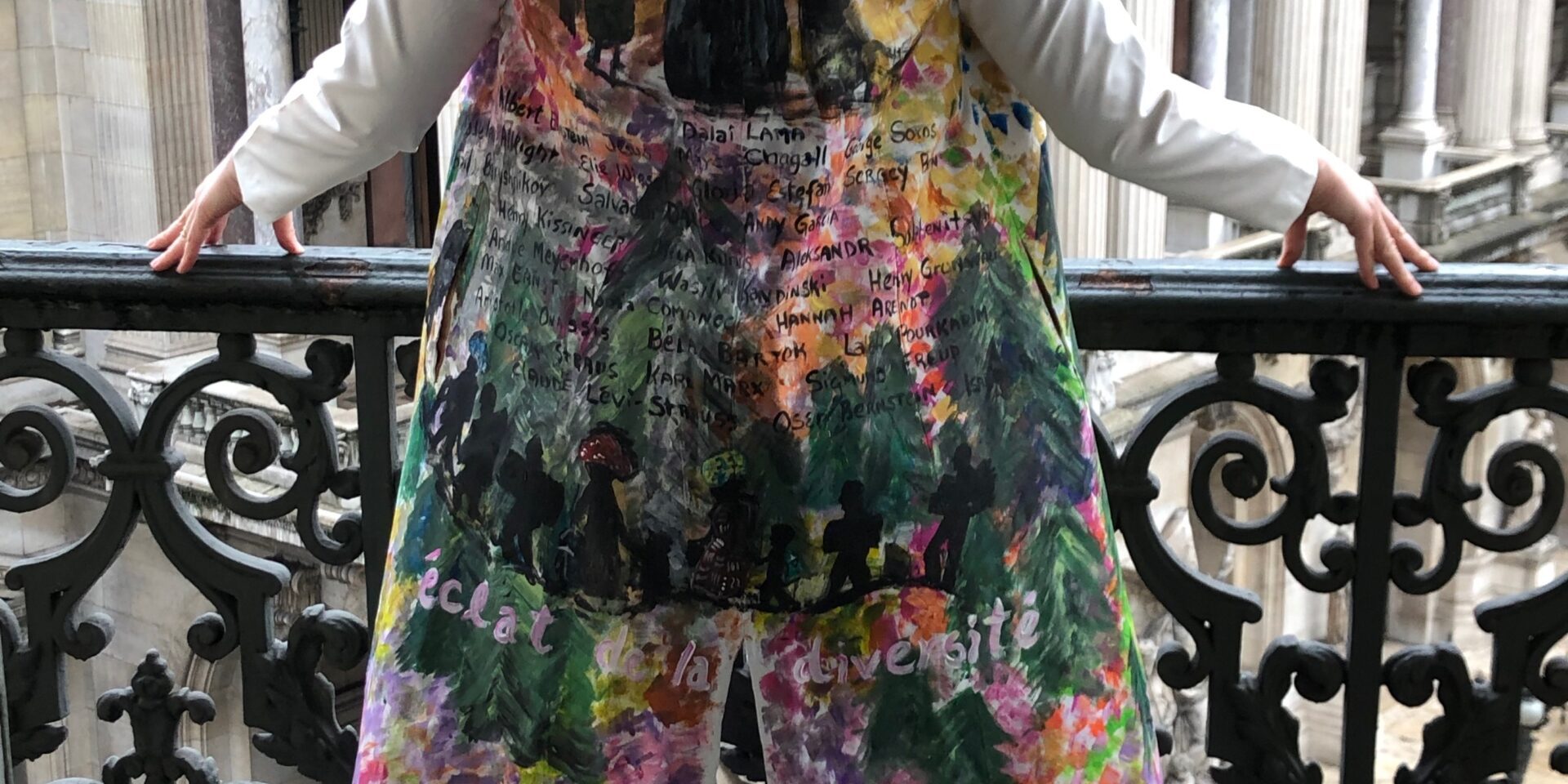 Hand painted silk coat celebrates our differences painted together. Hues of the forest during autumn painted on front panels. The back of the coat celebrates journey of refugees leaving their homes and countries. The runway design of this coat used tiny lights showing the way along the path. Hook/eye closures. Finale design at Paris Fashion Week Fall/Winteer 2019