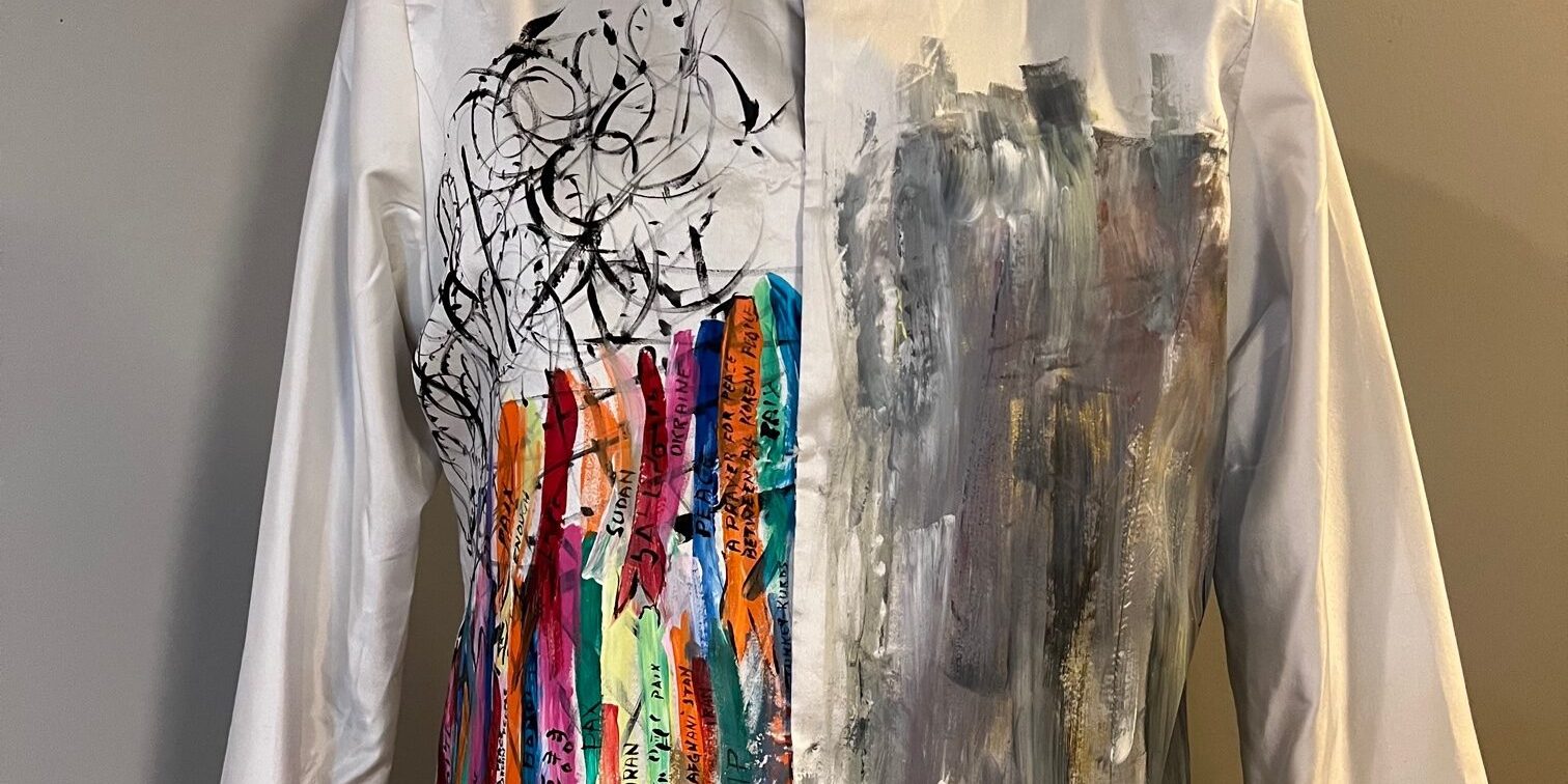 White 2 ply silk coat with round collar and hook closures. The potential for a common ground through inclusion and freedom – from barriers and differences. Bridges to one another. Freedom from barriers and cityscape hand painting. All jackets painted to order.