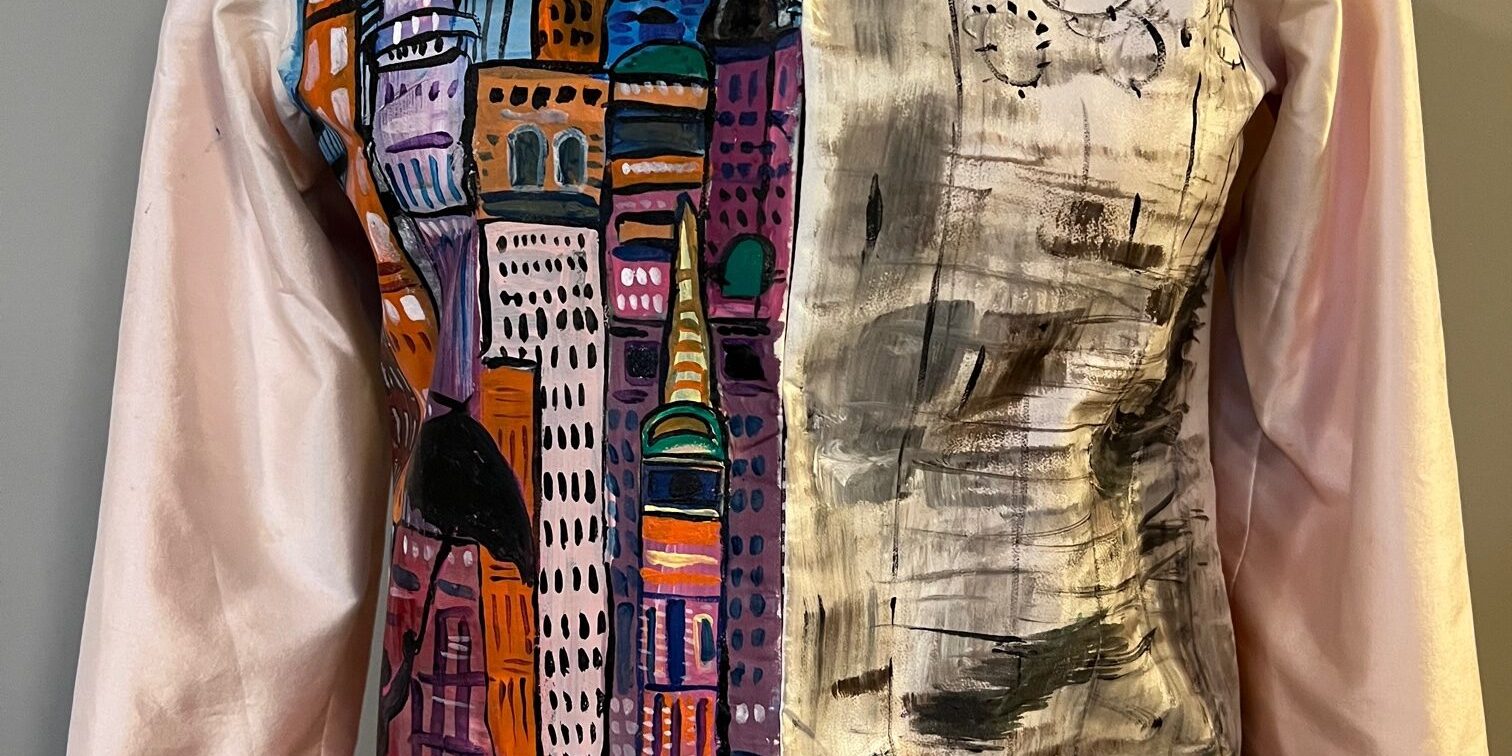 White 2 ply silk coat with round collar and hook closures. The potential for a common ground through inclusion and freedom – from barriers and differences. Bridges to one another. All jackets painted to order.